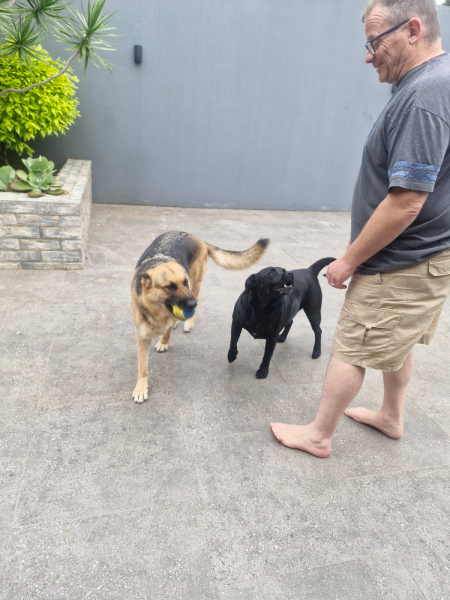 By the time I returned home, the male had already been adopted. But, when we were introduced to the female, it was love at first meeting. Later that same day, we introduced her to our older German Shepherd and our Staffie cross, and, thankfully, it all went well. We had our inspection and passed with flying colours. In November 2024, she joined the family.