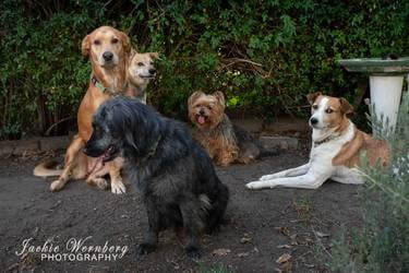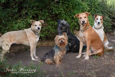 Robyn Eshelby shares her precious pack. “This is our precious motley bunch of rescues, retirees, lap dogs, and working dogs who share our life on our small subsistence farm in Chartwell North, Johannesburg. CLAW and FORA see me coming!”