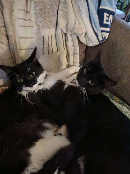 “Immediately we knew we’d connected with Obsidian (Sid) and Onyx (Nyx), and have been so lucky to see them grow into the adventurous, loving fur babies they are. They’ve grown so big from when we first saw them. They’re such happy-go-lucky cats that love being outside and exploring, and always come for cuddles come bed time.