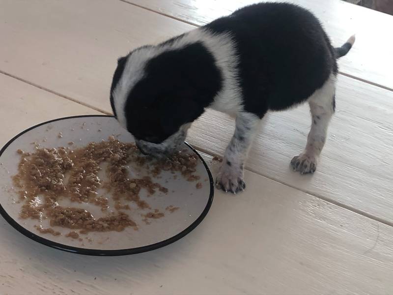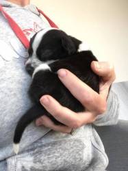A tiny bundle the size of a margarine tub arrived amidst terrible excitement from my two German Shepherd Dogs and sixteen-year-old Belgian Tervuren. The pup could barely stand and looked like a little black-and-white rat. One of his eyes was milky, and it was thought that he might lose it.