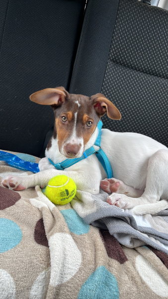His happiest moments are spent running freely on the beach. Although not quite brave enough yet for the waves, he’ll happily explore tidal pools and is slowly building his confidence. He’s also developed a love for toys. In the beginning, he’d only play with sticks or rope. Today, his favourite toy is a silicone Frisbee, and he’s still perfecting his ability to catch it mid-air.