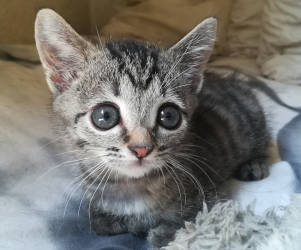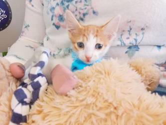 The four-week-old kitten weighed just 310g and had obvious skeletal issues, although he didn’t appear to have Down’s Syndrome. He was then diagnosed as having Radial Hypoplasia in both front legs; he was also very slow developmentally.