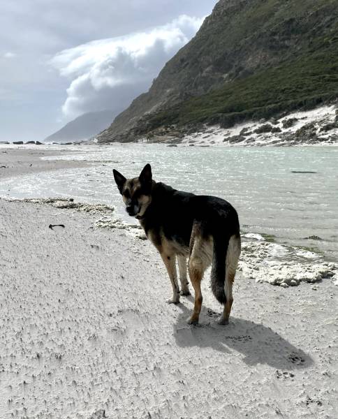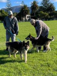 In June 2022, Noordhoek resident Anthea Rickard contacted us after seeing the post for Skylar and said she’d like to meet her. She had a German Shepherd cross named Kyle who was around eight years old, and although he got on well with other dogs, he was quite vocal when other dogs paid his Mom too much attention. He’d had a bad start, picked up by law enforcement in 2019 running on the R43, and from his condition it was clear he’d been on the road a long time. Anthea had done lots of work with him and they were very bonded, so we knew that getting the introduction right would be vital. We met up in a neutral place and did a slow intro between Skylar and Kyle. The intro went well, apart from some possessive barking, although there was no aggression from Kyle and Skylar wasn’t reactive in any way.
