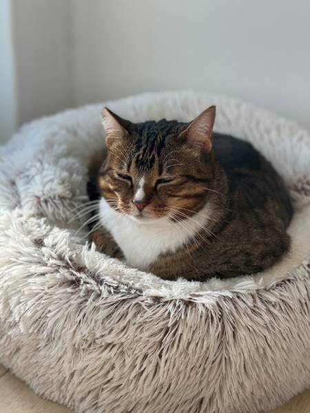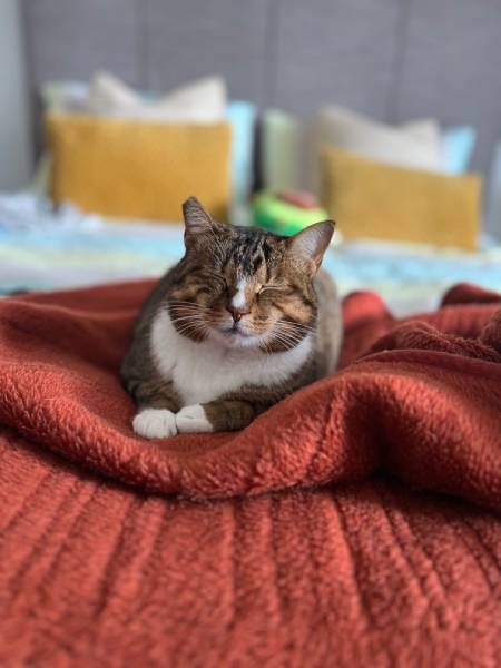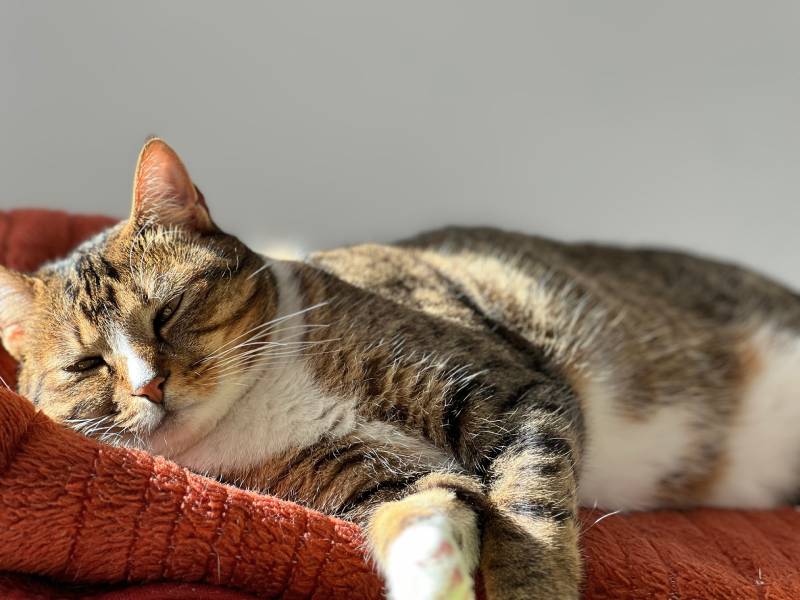 Today, Cinnabon has traded alleyways for soft blankets and sunny spots. She still has her fierce spirit, but she's also found comfort in cuddles, naps, and quiet companionship.