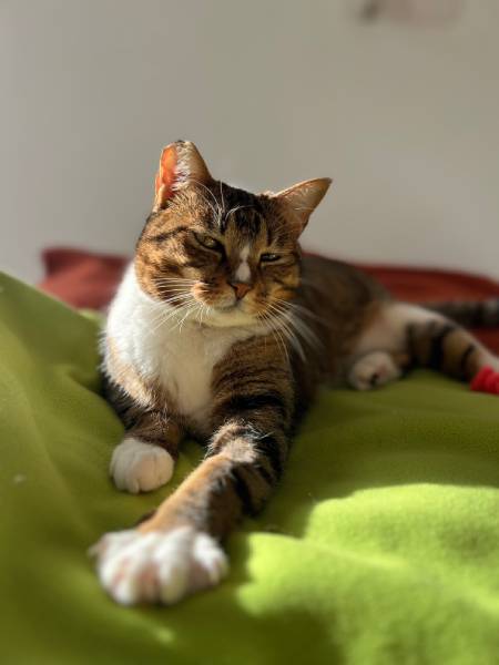 She absolutely loves to sunbathe. This is her favourite activity to do after eating in the morning and in the late afternoons. Her main way of showing us affection is though licks! She also has her favourite green blanket and will only sit on the bed if her blanket's there. She loves her playtime and her two wand toys. Cinnabon is very vocal and doesn't have a typical meow, which makes her even more unique.