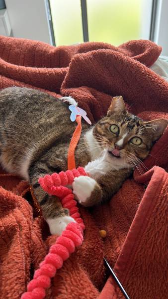 Cinnabon has blossomed into a very loving and playful cat! She's very intelligent and is attentive to words we say to call her for food, treats and wet food.