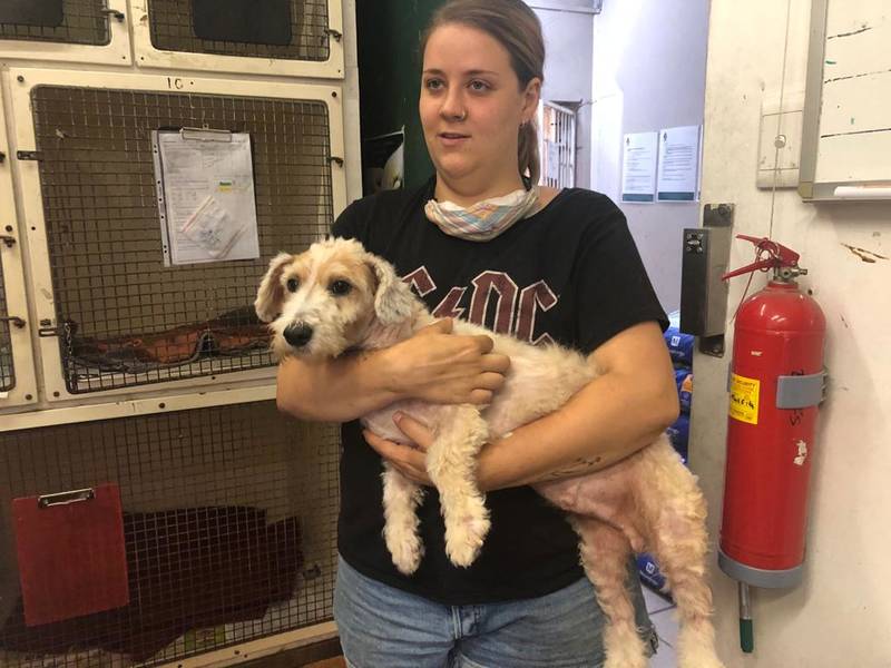 The little dog was named Ted, and he was so scared of people it seemed as though he’d never had any human contact and had been chased away and on the run all his young life. The veterinary team immediately began treatment. His fur was matted and full of tight dreads that had ripped his skin open, enabling maggots to infest the wounds. He was also suffering from chronic sarcoptic mange and a secondary bacterial infection. Ted was sedated and then the matted fur, mainly around his face and neck, was shaved off (a process that took less than 30 minutes, as his body had so little fur due to the mange). He was then given a medicated bath with Virbac Sebolytic shampoo, and later he tucked into a Christmas lunch of chicken, likely the first time he’d ever eaten it.
