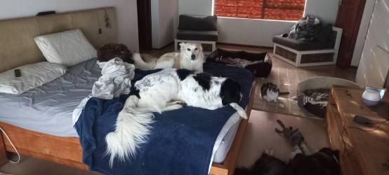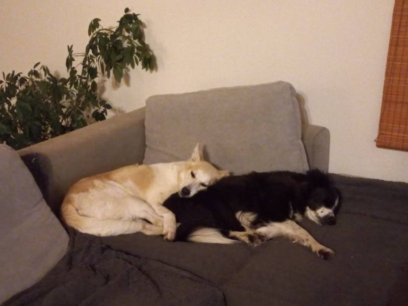 In the beginning, she started to protect me on the bed, growling at the other dogs when they came near me. I immediately told her off and quite soon she understood. After a week or so, she understood that she had to share, which was very difficult for her. When she lay on the sofa and I stroked her, she was immediately startled and raised her head up; now she’s totally relaxed – even when she’s fast asleep, I pet her and she’s totally fine with it.