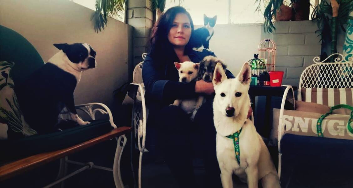 Left to right: Cookie (the Boston), Megan with pups Alaska and Ash, Tum Tum the kitten on her shoulder and Hope (front)